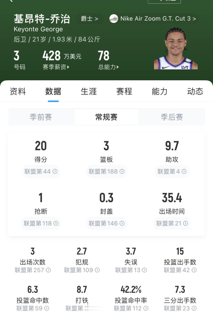 第5给乔治!看看乔治的数据,20分9.7助攻,绝对的巨星苗子来了!他在自己的第3个赛季打出了全明星的水准!