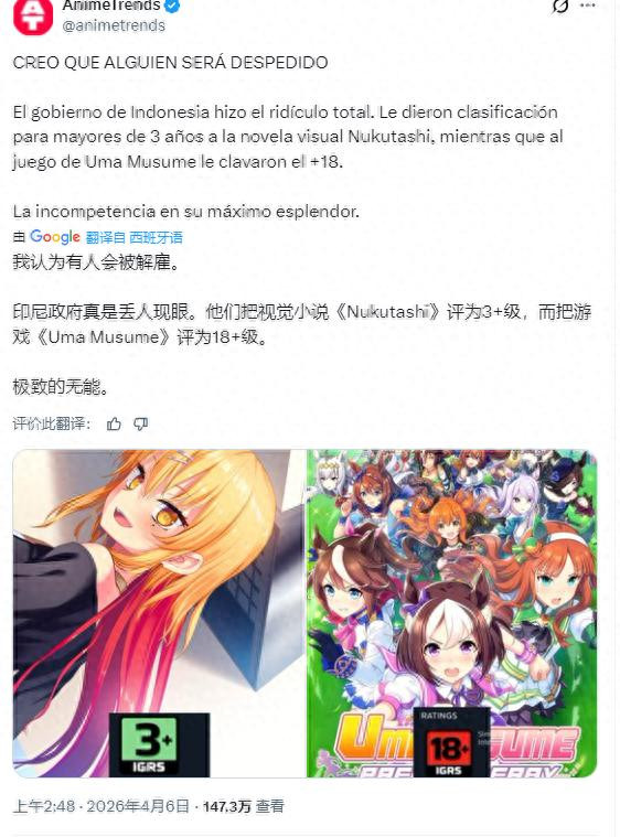 本土知名工作室Toge Productions创始人Kris Antoni发现在印尼,当地分级系统给了赛马娘 Pretty Derby一个18+评级。