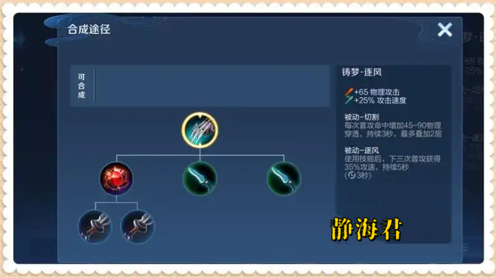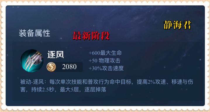 影刃:影刃可以提供物攻、攻速、暴击率、移速和暴风被动,和它相比的话,逐风有两个优势:一是有生命值加成(容错率更高),二是装备适配范围大(影刃只能陪暴击装)。