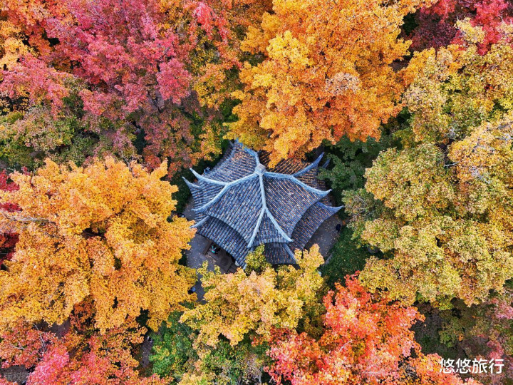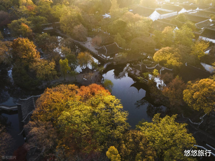 古典园林与斑斓秋色完美融合,金黄的银杏、火红的枫叶,层层浸染。