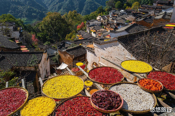 篁岭的晒秋时段,辣椒、玉米、南瓜铺满徽派建筑的屋顶,搭配山间渐红的乌桕树,可在晒秋观景台、晒工坊拍照。
