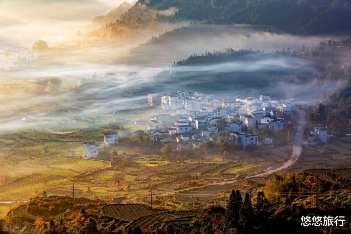 江岭村一号观景台看云海,三四号观景台可拍红枫。李坑的民居宅院沿溪而建,粉墙黛瓦、参差错落。