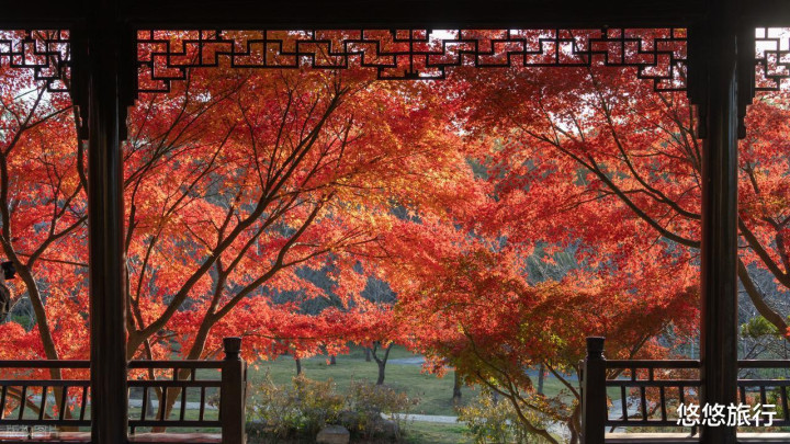 栖霞山枫岭、中山植物园红枫岗、明孝陵石象路、音乐台梧桐径,红枫似火,掩映着亭台楼阁、寺院古建,随手一拍就是古风大片。
